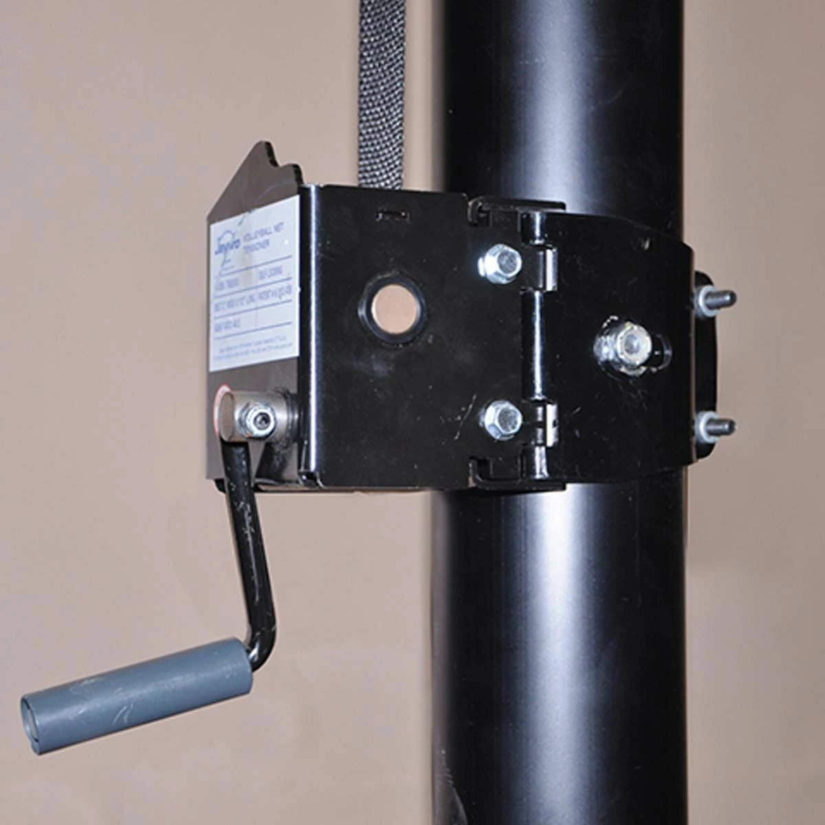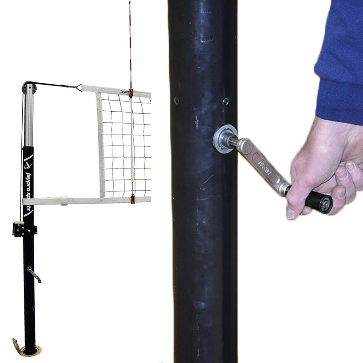 The Jaypro PVB-1500 net system features 3-1/2″ outside diameter uprights with a hybrid design comprised of a steel bottom for strength and an aluminum top for reduced weight. This high-performance, yet affordable volleyball net system is designed for international, collegiate and high school play. The pin-stop height adjustment allows for sixteen different net heights ranging from 6′-6″ to 8′-2″. This volleyball system includes the patented Flex Net which eliminates all cumbersome cables and replaces them with heavy-duty, woven nylon top and bottom bands. The headband attaches directly to the winch leader strap to provide superb net tension. Designed for systems set at a maximum of 36′ 8″ on center and a minimum of 35′ on center (normal spacing is 35′ 10″).