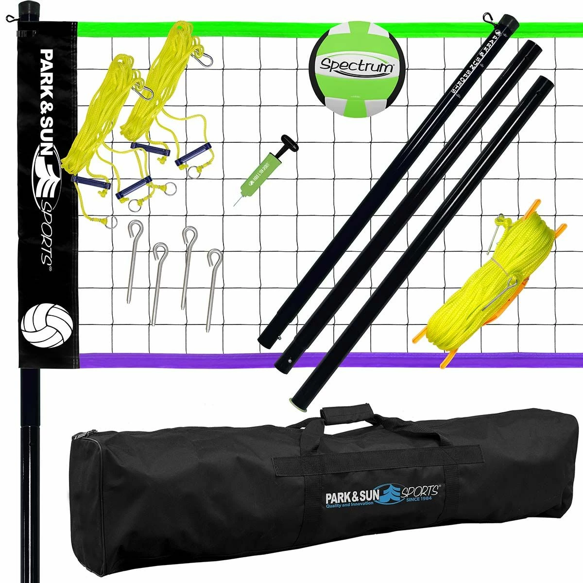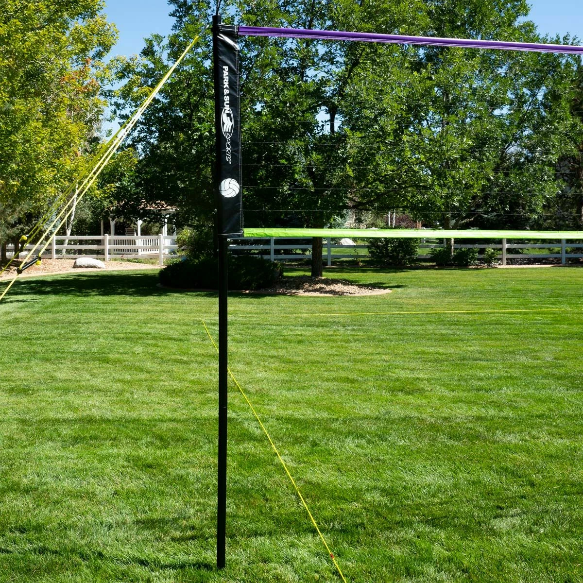 The Park & Sun Spiker Sport SL is a complete volleyball net system that comes with everything needed for a fun & dynamic outdoor volleyball game. This set includes a regulation size 3’ x 32’ net with 5” net sleeve, 1.5” net tapes with reinforced corners, 1-1/2” 3-piece steel poles with easy to use push-button locks, an 18 panel Soft Touch volleyball, guylines, a pre-measured boundary for standard court dimensions of 60’ L x 30’ W, a volleyball hand pump, and a full size carrying bag with zipper and carrying straps. This net system features a flip-able net design that allows you to choose between phantasmic purple or photon green for the net tape color. The net height is easily adjusted by sliding the net to the desired playing height and then locking it in place with net clips.