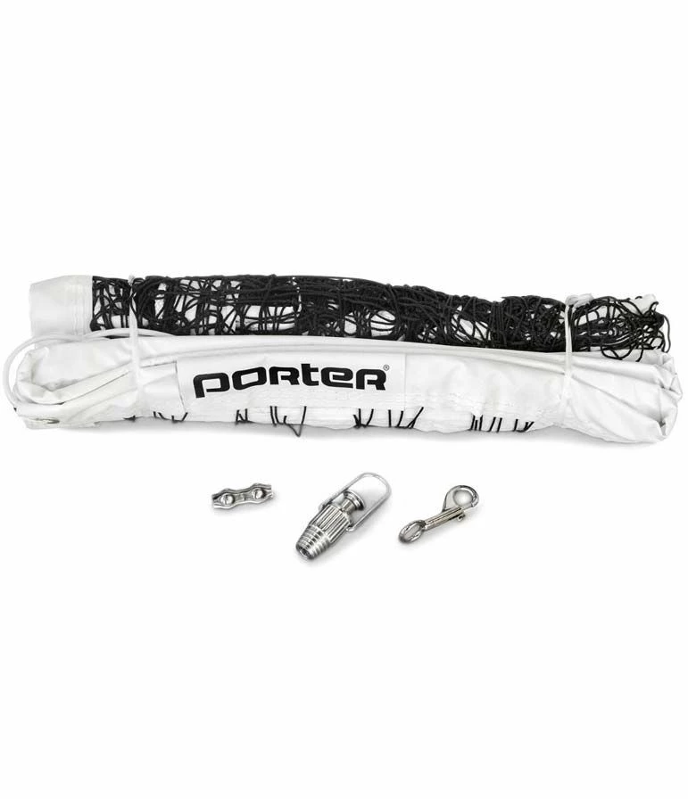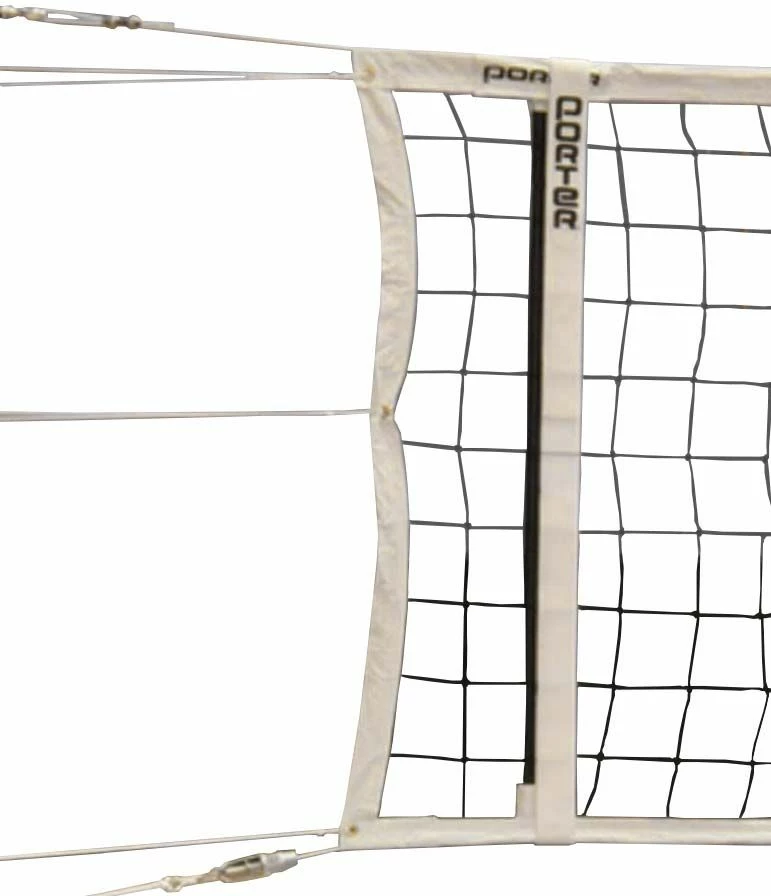 The Porter Power volleyball net exceeds all specification requirements for competition. This net fits net systems with various floor sleeve spacing and offers a spring loaded instant tensioning system, fiberglass dowels, 44′ vinyl coated top cable, and locking buckles. This net is compatible with Powr-Rib II, Powr-Trak and Economy systems