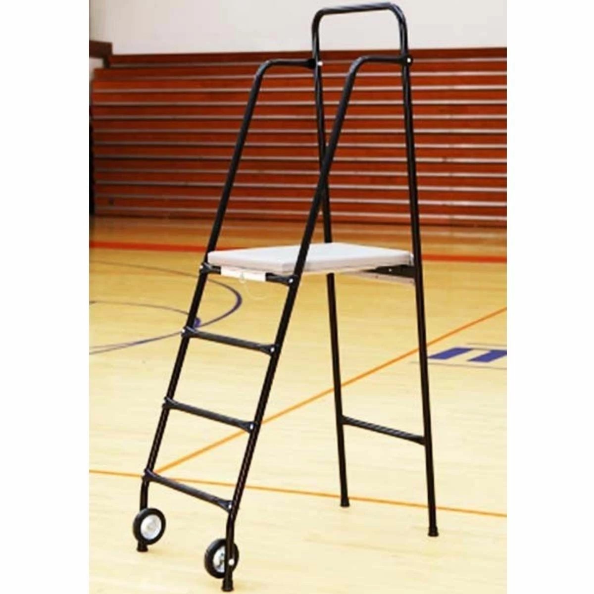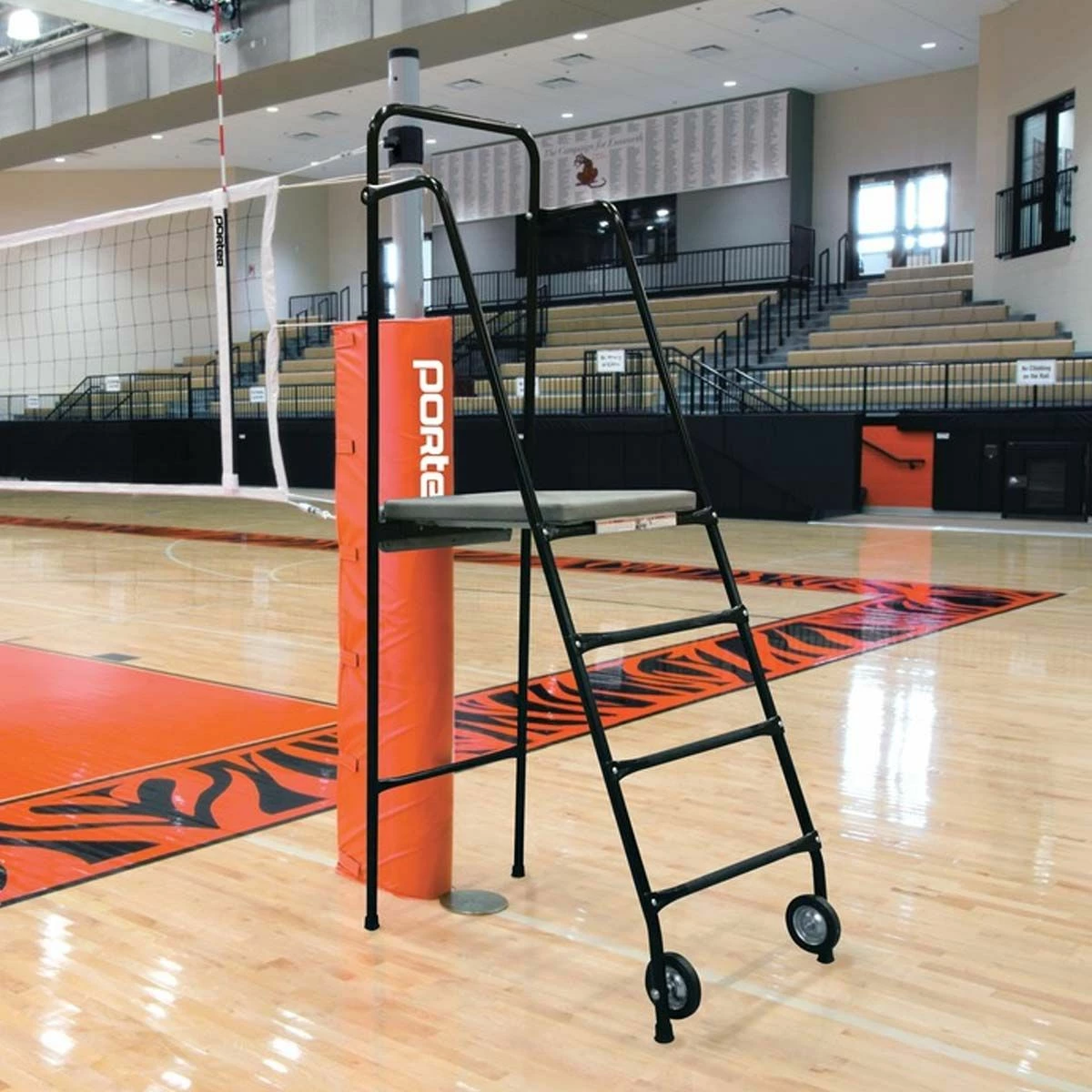 The free standing Porter 669100 volleyball referee stand easily folds down, allowing the entire stand to be flat for storage. This portable volleyball judge’s stand is ideal for use as a training aid or on older base or cabled type volleyball systems. Non-marking casters provide easy transport to any location. This steel judge’s stand is equipped with a black powder coated finish with a grey vinyl padded platform. Optional protective padding, that meets all requirements for competition, is sold separately.