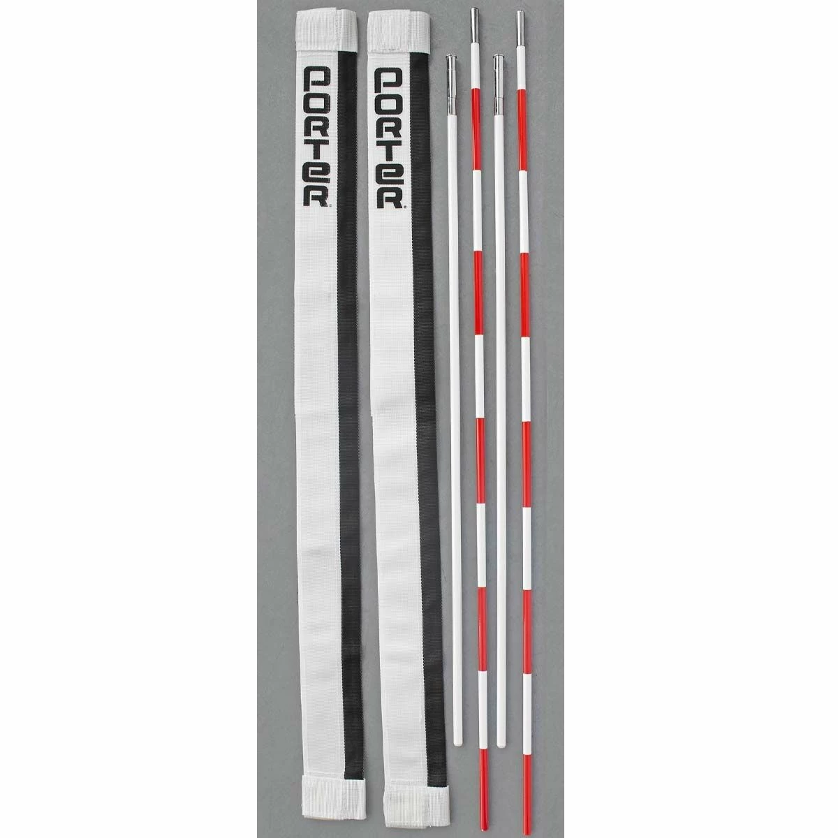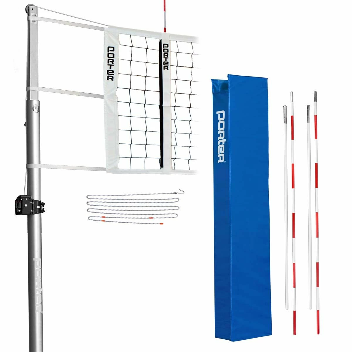 The Powr-Line Porter volleyball net system has high strength, lightweight aluminum uprights designed to meet the most exacting demands for any level of play. This package includes Powr-Line uprights (A25-169), protective pads, competition net. boundary mark with antennas and a fair height chain. The aluminum telescoping uprights allow for easy and infinite height adjustment with a heavy duty pressure lock T-handle. The internal counter-balance system eases height adjustment with a constant tension spring mechanism. No more fixed height settings or awkward pin to set. The telescoping upright glides smoothly and safely up and down eliminating potential accidents while changing net height. Net installation is simple and incredibly quick with the Powr-Winch net tensioner. There is a nylon tension strap on Powr-Winch to eliminate cable kinking, coiling and fraying which adds life expectancy to the net. A removable crank handle is also included. Net heights are Olympic competition through elementary height settings as specified by the FIVB, NFHS and the United States Volleyball Association.